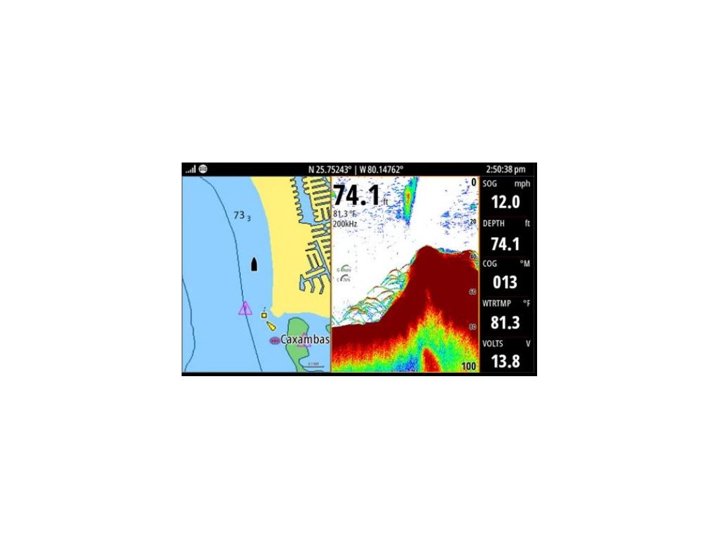 Podívejte se na požadované detaily tak, jak chcete! Simrad Cruise nabízí zobrazení na celou obrazovku i na rozdělené obrazovce, kde si můžete snadno zobrazit Vámi potřebné informace. Plánujete svůj kurz? Výběrem mapy na celou obrazovku získáte maximální přehled o svém okolí. Nejste si jisti, co je pod vámi? Vyberte si sonarové zobrazení na celou obrazovku pro jasný pohled na dno a automatické sledování hloubky. Chcete to vidět všechno? Použijte možnost rozdělené obrazovky pro dokonalou kombinaci dat z mapy a sonaru.