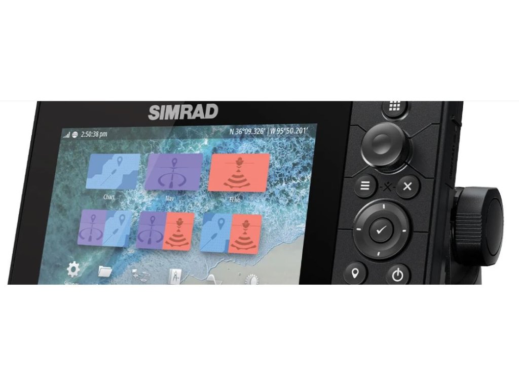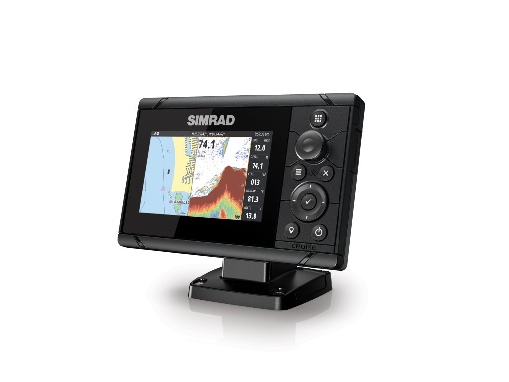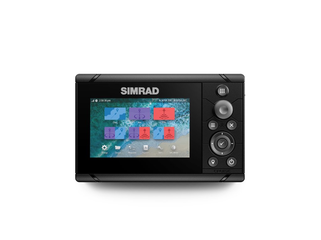 Simrad Cruise může zobrazovat mapy, navigaci a sonar v zobrazení rozdělené obrazovky nebo samostatně na celou obrazovku. Ovládací prvky otočného ovladače a klávesnice usnadňují navigaci v nabídkách, vytváření tras a přístup k údajům o teplotě, rychlosti, hloubce a napětí baterie.
