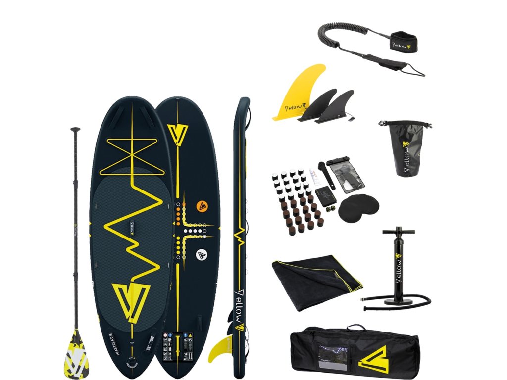 Balení obsahuje: SUP, 2v1 pádlo, pumpa, přenosná taška, sada na opravu, vodotěsné pouzdro na mobilní telefon, ručník YellowV, herní sada
