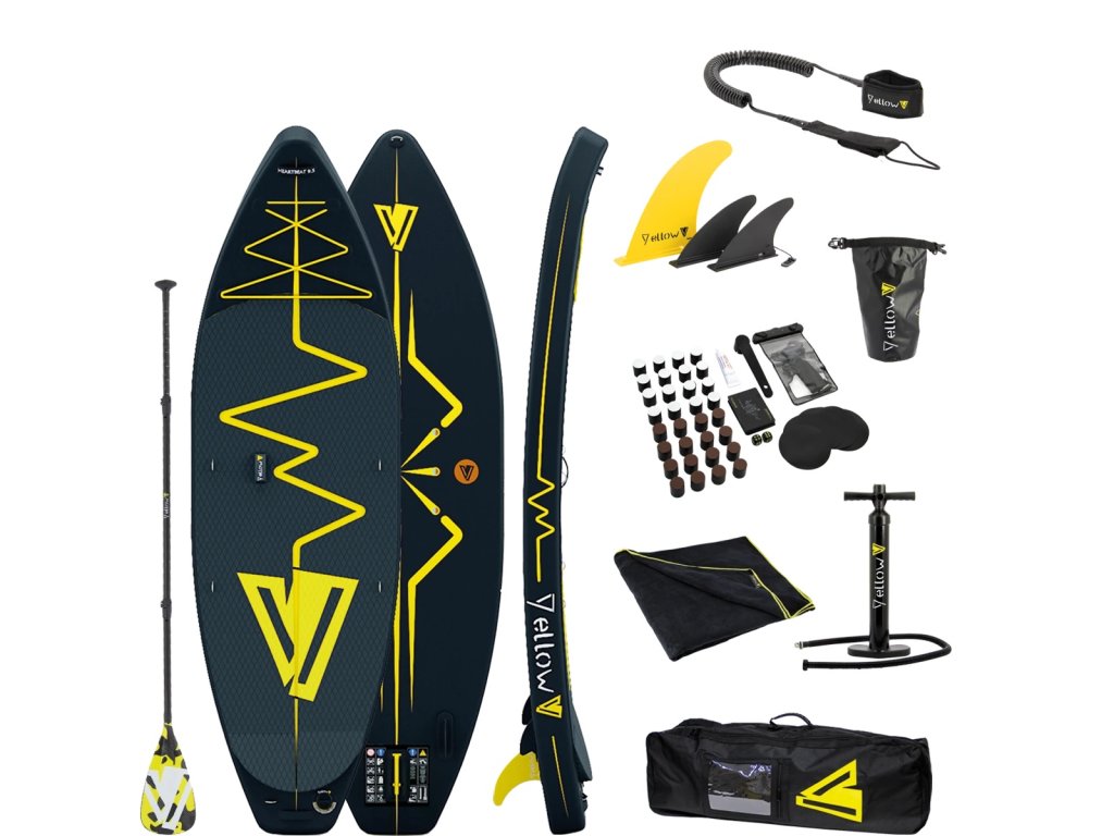 Balení obsahuje: SUP, 2v1 pádlo, pumpa, přenosná taška, sada na opravu, popruh, vodotěsné pouzdro na mobilní telefon, ručník YellowV, herní sada