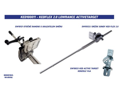 Součástí sestavy je nerezový držák sondy KedFlex 2.0, výměnná konzole Lowrance ActiveTarget a otočné rameno s ukazatelem směru.