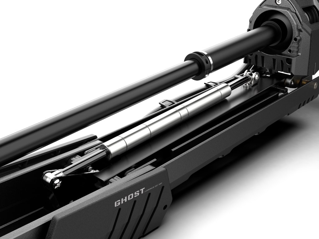 Elektromotor Ghost má dvojčinnou plynovou pístovou pružinu, která umožňuje velice tiché spuštění motoru. Právě tato pístová pružina hlavu motoru při spuštění zbrzdí tak, že ani dopad hlavy motoru na vodní hladinu není prakticky slyšet. Ani při vytahování není nutné s motorem dále manipulovat – ten se totiž při vytažení automaticky nastaví díky integrovanému stabilizátoru do ideální polohy pro usazení ve svém držáku.