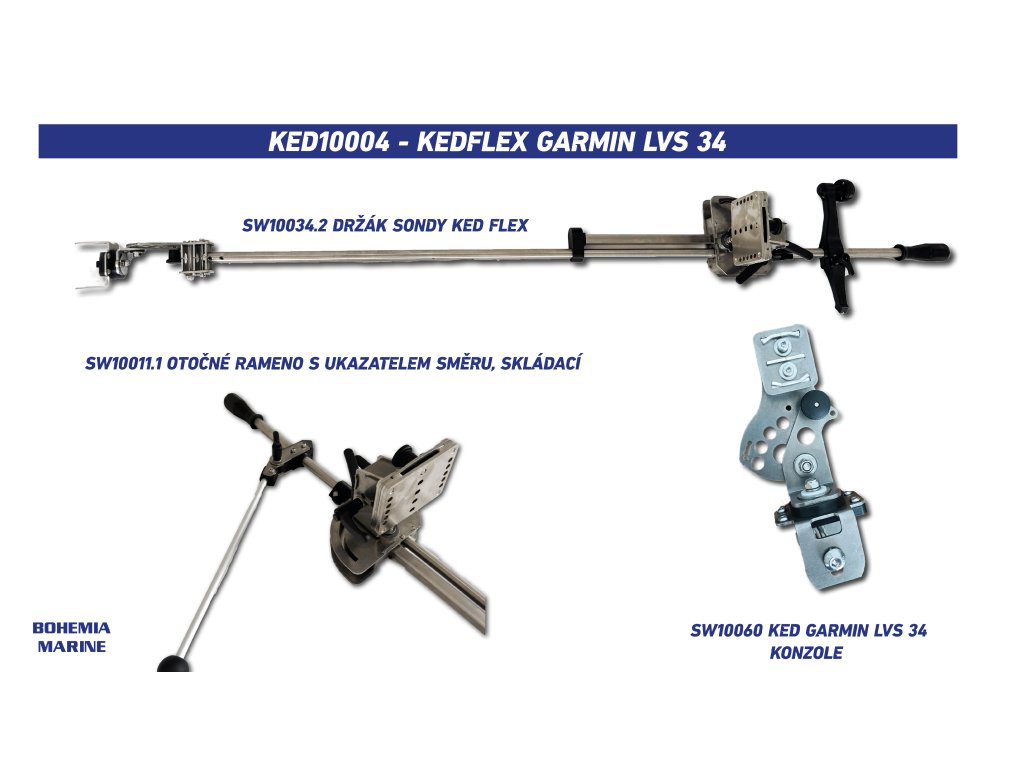Součástí sestavy je nerezový držák sondy KedFlex, výměnná konzole KED Garmin LVS 34 a skládací otočné rameno s ukazatelem směru.